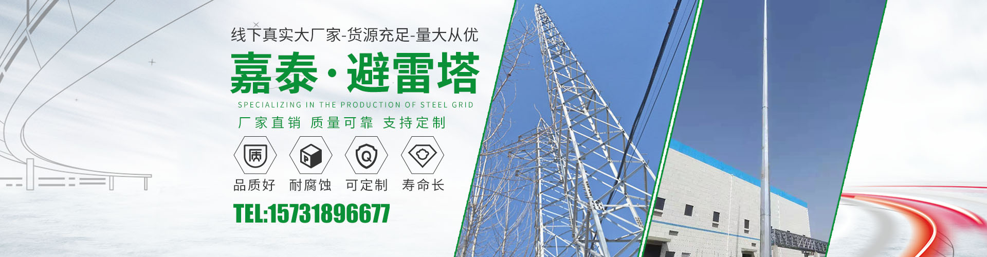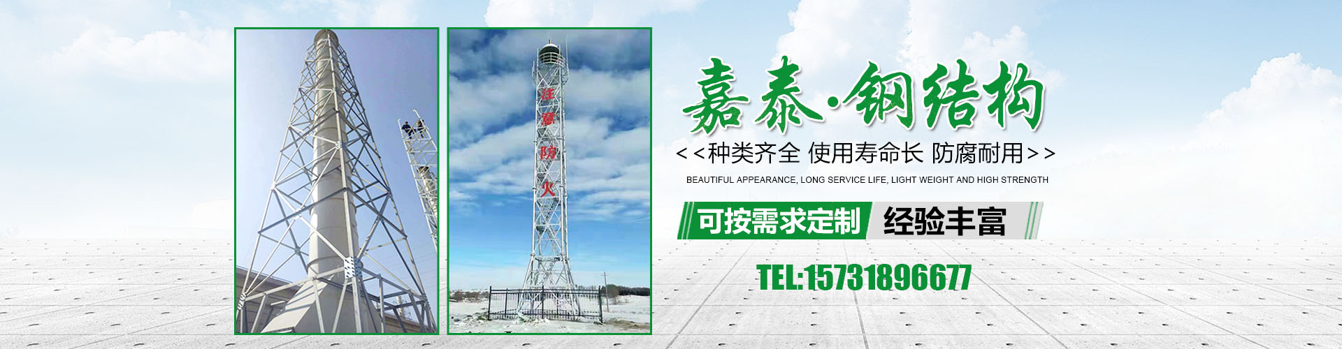 衡水嘉泰钢结构有限公司位于铁塔制造之乡-衡水市景县广川经济开发区,石德、京九铁路交汇处,距北京、天津、石家庄、济南均在2小 时交通圈内,交通便利。公司主要产品有:避雷塔、监控塔、瞭望塔、消防训练塔、电力架构、楼顶工艺塔、广播电视塔、烟囱塔、测风塔 、电力塔、单管塔、雷达塔、仿生树塔、气象观测塔、路灯杆,一体化基站、ETC龙门架等,是一家集设计,生产,运输,安装,维护为一体的厂家。主要服务于铁塔公司、通信三大运营商、国防通讯,铁路及森 ......